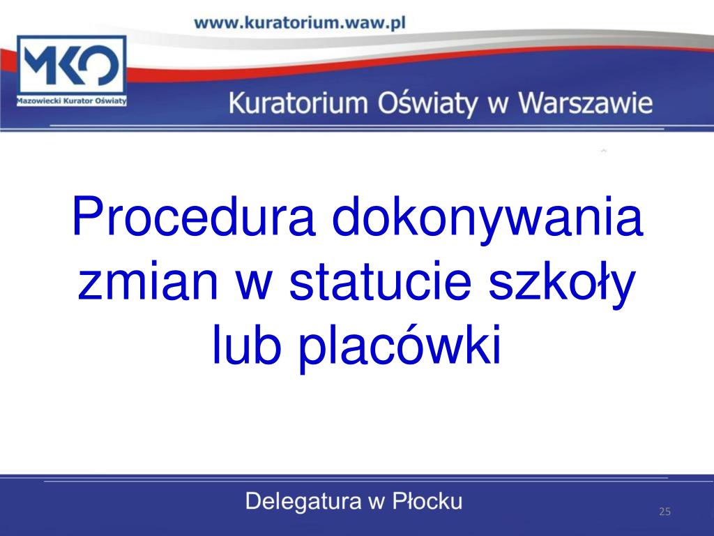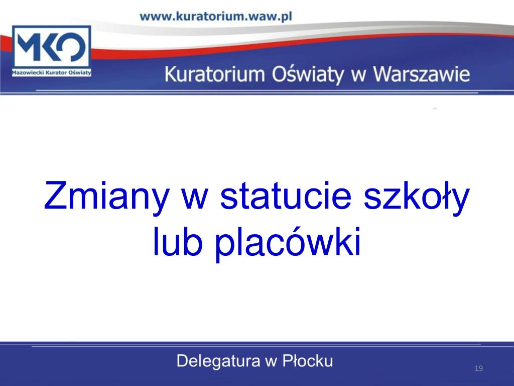 Czynniki determinujące konieczność dokonywania zmian w statucie szkoły to m. in.: • zmiany zachodzące w przepisach prawa oświatowego, powszechnego i lokalnego • zmiany w specyfice szkoły • potrzeba nowych rozwiązań organizacyjnych i strukturalnych w funkcjonowaniu społeczności szkolnej • zalecenia organów kontrolnych i nadzorujących (niespójność rozwiązań statutowych z obowiązującym prawem) • inne potrzeby (np. zmiana nazwy, nadanie imienia itp.)
