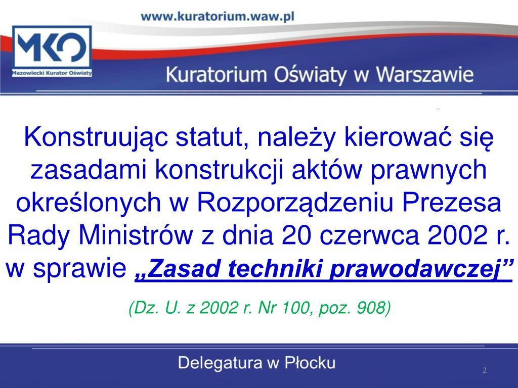 STATUT SZKOŁY LUB PLACÓWKI. Struktura i procedury zmian Płock, wrzesień 2013 roku. Konstruując statut, należy kierować się zasadami konstrukcji aktów prawnych określonych w Rozporządzeniu Prezesa Rady Ministrów z dnia 20 czerwca 2002 r. w sprawie „Zasad techniki prawodawczej”
