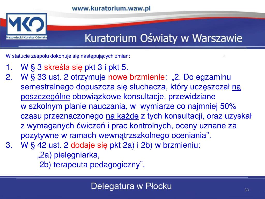 W statucie zespołu dokonuje się następujących zmian: • W § 3 skreśla się pkt 3 i pkt 5. • W § 33 ust. 2 otrzymuje nowe brzmienie: „2. Do egzaminu semestralnego dopuszcza się słuchacza, który uczęszczał na poszczególne obowiązkowe konsultacje, przewidziane w szkolnym planie nauczania, w wymiarze co najmniej 50% czasu przeznaczonego na każde z tych konsultacji, oraz uzyskał z wymaganych ćwiczeń i prac kontrolnych, oceny uznane za pozytywne w ramach wewnątrzszkolnego oceniania”. • W § 42 ust. 2 dodaje siępkt 2a) i 2b) w brzmieniu: „2a) pielęgniarka, 2b) terapeuta pedagogiczny”.