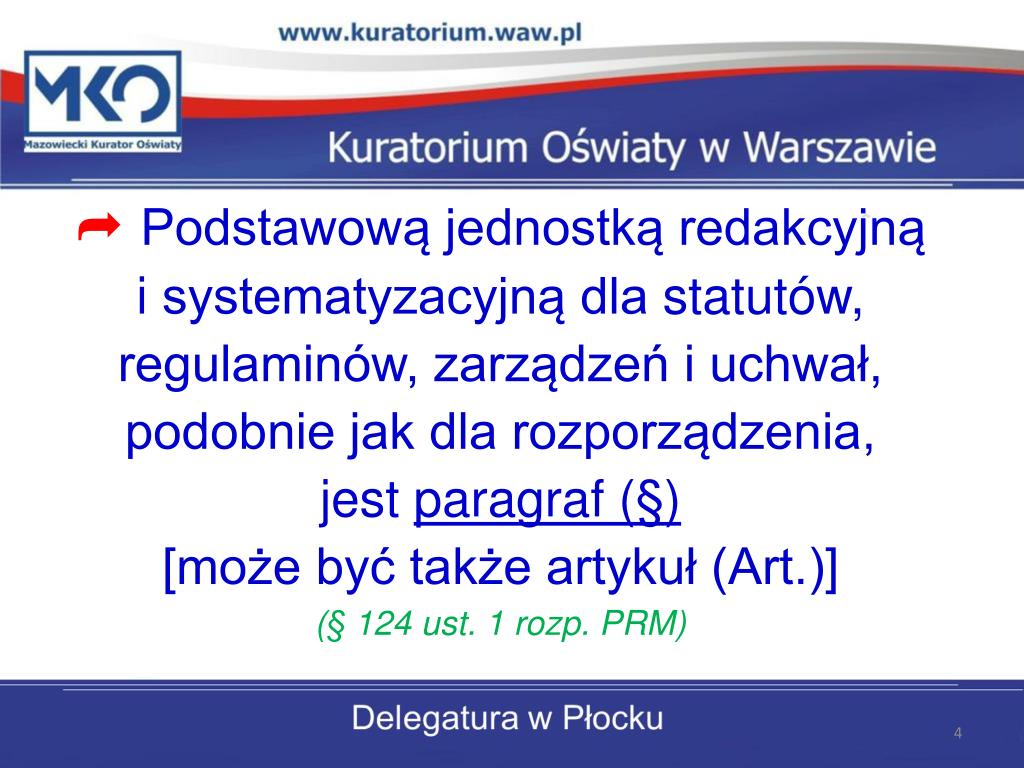 Podstawową jednostką redakcyjną i systematyzacyjną dla statutów, regulaminów, zarządzeń i uchwał, podobnie jak dla rozporządzenia, jest paragraf (§) [może być także artykuł (Art.)](§ 124 ust. 1 rozp. PRM)