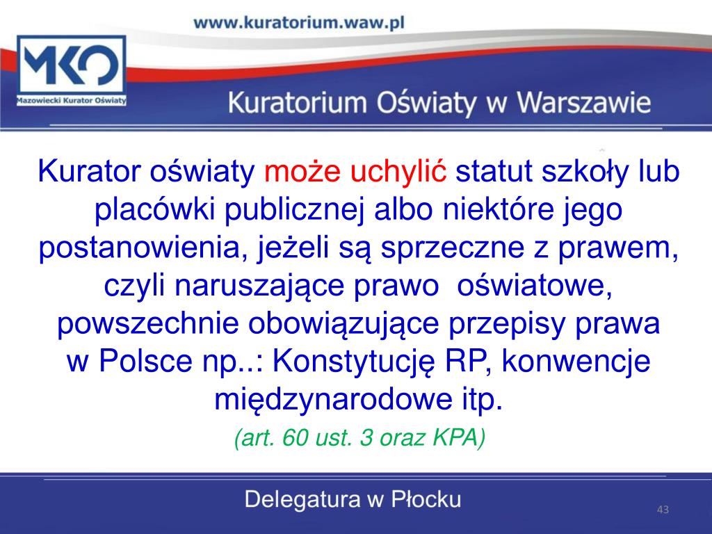 Kurator oświaty może uchylić statut szkoły lub placówki publicznej albo niektóre jego postanowienia, jeżeli są sprzeczne z prawem, czyli naruszające prawo oświatowe, powszechnie obowiązujące przepisy prawa w Polsce np..: Konstytucję RP, konwencje międzynarodowe itp. (art. 60 ust. 3 oraz KPA)
