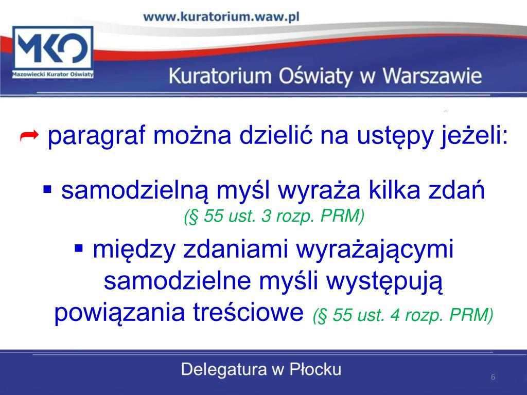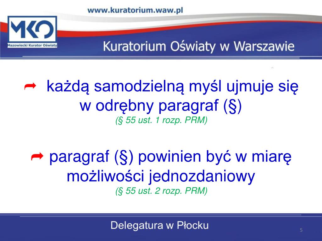 każdą samodzielną myśl ujmuje się w odrębny paragraf (§) (§ 55 ust. 1 rozp. PRM) paragraf (§) powinien być w miarę możliwości jednozdaniowy(§ 55 ust. 2 rozp. PRM)