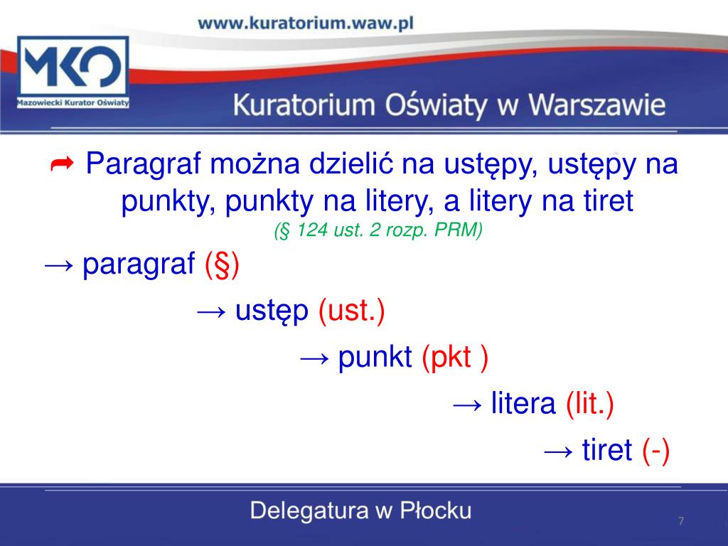 Paragraf można dzielić na ustępy, ustępy na punkty, punkty na litery, a litery na tiret (§ 124 ust. 2 rozp. PRM) → paragraf (§) → ustęp (ust.) → punkt (pkt ) → litera (lit.) → tiret (-)