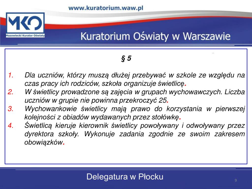 § 5 • Dla uczniów, którzy muszą dłużej przebywać w szkole ze względu na czas pracy ich rodziców, szkoła organizuje świetlicę. • W świetlicy prowadzone są zajęcia w grupach wychowawczych. Liczba uczniów w grupie nie powinna przekroczyć 25. • Wychowankowie świetlicy mają prawo do korzystania w pierwszej kolejności z obiadów wydawanych przez stołówkę. • Świetlicą kieruje kierownik świetlicy powoływany i odwoływany przez dyrektora szkoły. Wykonuje zadania zgodnie ze swoim zakresem obowiązków.