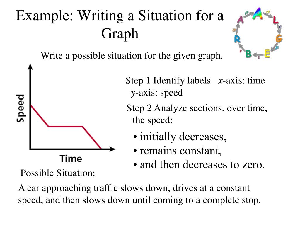 Example: Writing a Situation for a Graph Write a possible situation for the given graph. Step 1 Identify labels. x-axis: time y-axis: speed Step 2 Analyze sections. over time, the speed: • initially decreases, • remains constant, • and then decreases to zero. Possible Situation: A car approaching traffic slows down, drives at a constant speed, and then slows down until coming to a complete stop.