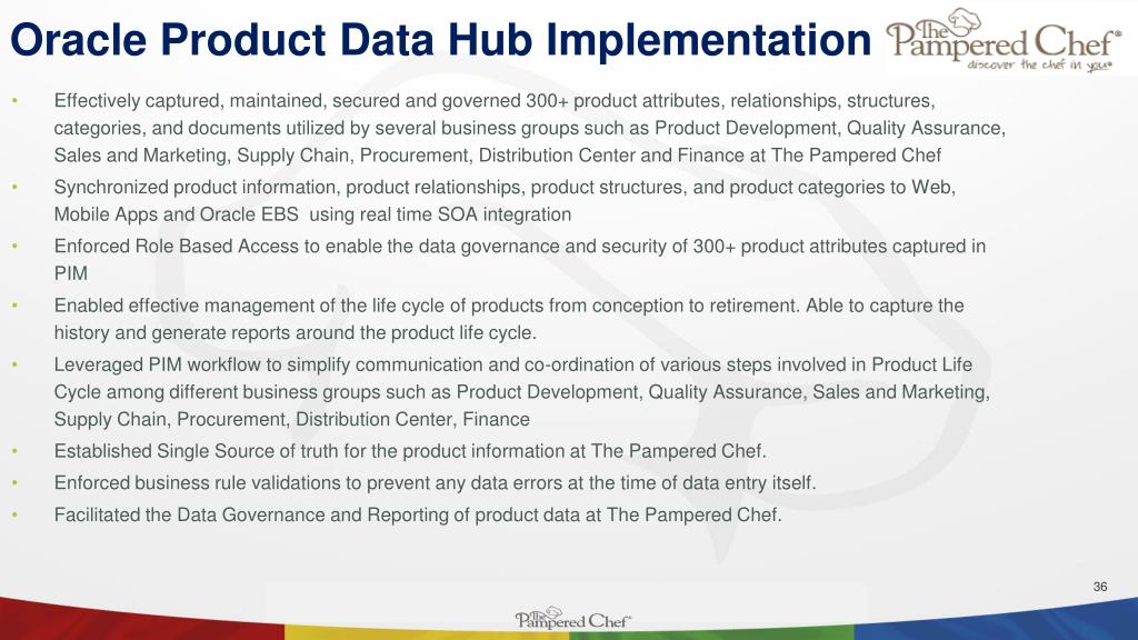 Oracle Product Data Hub Implementation 36 Effectively captured, maintained, secured and governed 300+ product attributes, relationships, structures, categories, and documents utilized by several business groups such as Product Development, Quality Assurance, Sales and Marketing, Supply Chain, Procurement, Distribution Center and Finance at The Pampered Chef Synchronized product information, product relationships, product structures, and product categories to Web, Mobile Apps and Oracle EBS using real time SOA integration Enforced Role Based Access to enable the data governance and security of 300+ product attributes captured in PIM Enabled effective management of the life cycle of products from conception to retirement. Able to capture the history and generate reports around the product life cycle. Leveraged PIM workflow to simplify communication and co-ordination of various steps involved in Product Life Cycle among different business groups such as Product Development, Quality Assurance, Sales and Marketing, Supply Chain, Procurement, Distribution Center, Finance Established Single Source of truth for the product information at The Pampered Chef. Enforced business rule validations to prevent any data errors at the time of data entry itself. Facilitated the Data Governance and Reporting of product data at The Pampered Chef.