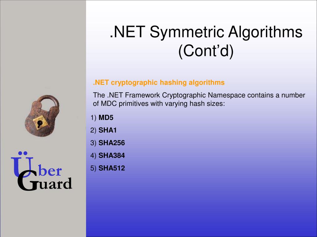 .NET Symmetric Algorithms(Cont’d) .NET cryptographic hashing algorithms The .NET Framework Cryptographic Namespace contains a number of MDC primitives with varying hash sizes: 1) MD5 2) SHA1 3) SHA256 4) SHA384 5) SHA512