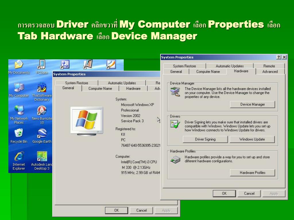 การตรวจสอบ Driver คลิกขวาที่ My Computer เลือก Properties เลือก Tab Hardware เลือก Device Manager
