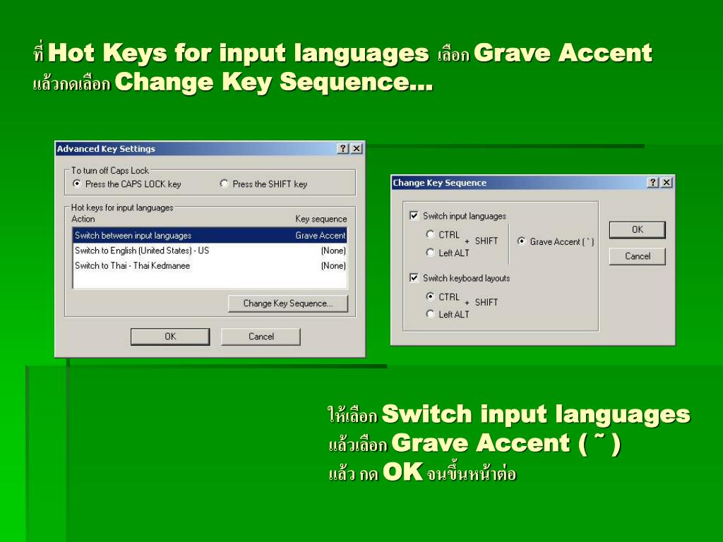 ที่ Hot Keys for input languages เลือก Grave Accentแล้วกดเลือก Change Key Sequence… ให้เลือก Switch input languages แล้วเลือก Grave Accent ( ˜ )แล้ว กด OK จนขึ้นหน้าต่อ