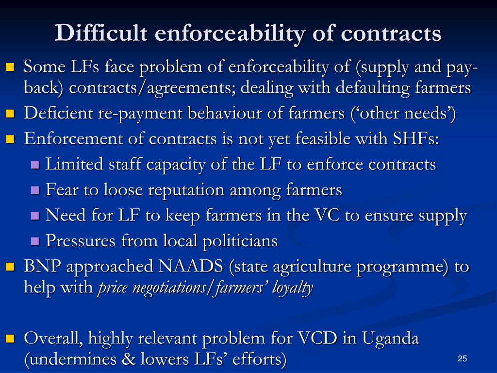 Difficult enforceability of contracts • Some LFs face problem of enforceability of (supply and pay-back) contracts/agreements; dealing with defaulting farmers • Deficient re-payment behaviour of farmers (‘other needs’) • Enforcement of contracts is not yet feasible with SHFs: • Limited staff capacity of the LF to enforce contracts • Fear to loose reputation among farmers • Need for LF to keep farmers in the VC to ensure supply • Pressures from local politicians • BNP approached NAADS (state agriculture programme) to help with price negotiations/farmers’ loyalty • Overall, highly relevant problem for VCD in Uganda (undermines & lowers LFs’ efforts)