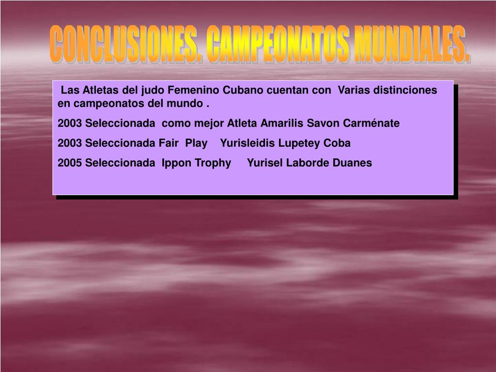 CONCLUSIONES. CAMPEONATOS MUNDIALES. Las Atletas del judo Femenino Cubano cuentan con Varias distinciones en campeonatos del mundo . 2003 Seleccionada como mejor Atleta Amarilis Savon Carménate 2003 Seleccionada Fair Play Yurisleidis Lupetey Coba 2005 Seleccionada Ippon Trophy Yurisel Laborde Duanes