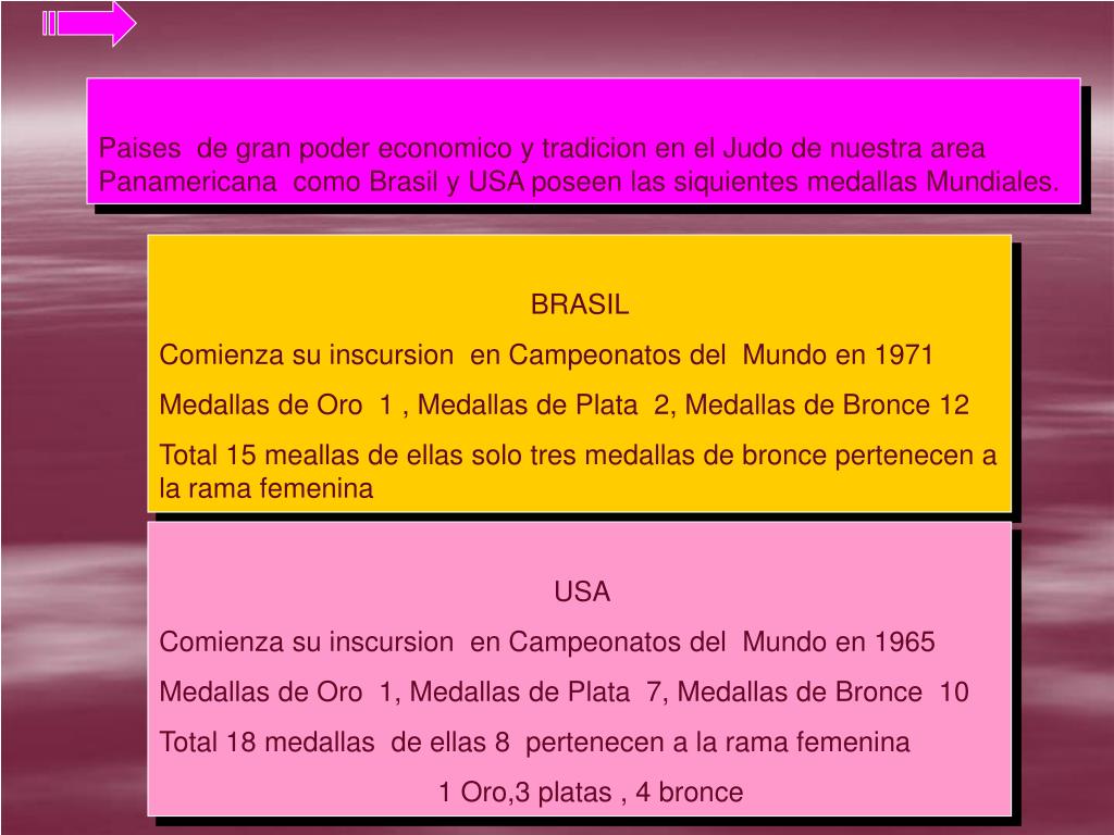 Paises de gran poder economico y tradicion en el Judo de nuestra area Panamericana como Brasil y USA poseen las siquientes medallas Mundiales. BRASIL Comienza su inscursion en Campeonatos del Mundo en 1971 Medallas de Oro 1 , Medallas de Plata 2, Medallas de Bronce 12 Total 15 meallas de ellas solo tres medallas de bronce pertenecen a la rama femenina USA Comienza su inscursion en Campeonatos del Mundo en 1965 Medallas de Oro 1, Medallas de Plata 7, Medallas de Bronce 10 Total 18 medallas de ellas 8 pertenecen a la rama femenina 1 Oro,3 platas , 4 bronce