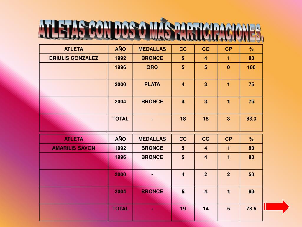 ATLETA ATLETA AÑO AÑO MEDALLAS MEDALLAS CC CC CG CG CP CP % % DIADENIS LUNA ODALIS REVE 1992 1992 BRONCE ORO 5 5 5 4 - 1 100 80 1996 1996 5TO 5TO 5 5 3 3 2 2 60 60 TOTAL TOTAL - - 10 10 8 7 3 2 80 70 ATLETAS CON DOS O MÁS PARTICIPACIONES.(CONT.)
