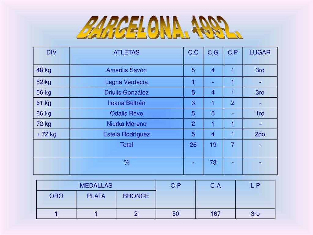 MEDALLAS C-P C-A L-P ORO PLATA BRONCE 1 1 2 50 167 3ro DIV ATLETAS C.C C.G C.P LUGAR 48 kg Amarilis Savón 5 4 1 3ro 52 kg Legna Verdecía 1 - 1 - 56 kg Driulis González 5 4 1 3ro 61 kg Ileana Beltrán 3 1 2 - 66 kg Odalis Reve 5 5 - 1ro 72 kg Niurka Moreno 2 1 1 - + 72 kg Estela Rodríguez 5 4 1 2do Total 26 19 7 - % - 73 - - BARCELONA. 1992.