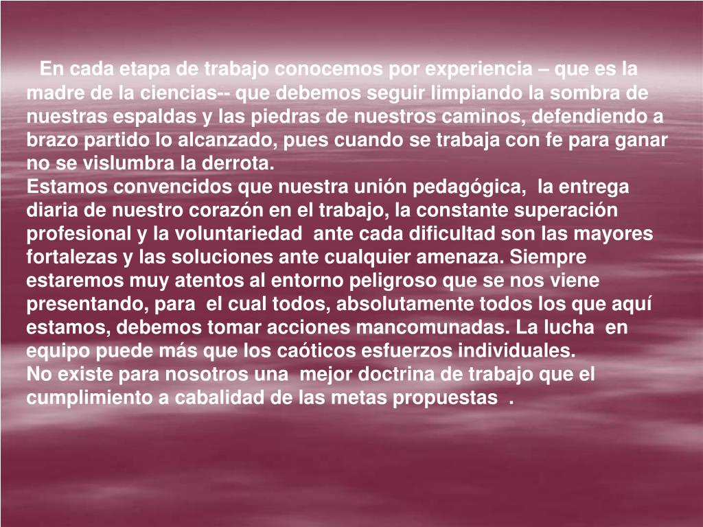 En cada etapa de trabajo conocemos por experiencia – que es la madre de la ciencias-- que debemos seguir limpiando la sombra de nuestras espaldas y las piedras de nuestros caminos, defendiendo a brazo partido lo alcanzado, pues cuando se trabaja con fe para ganar no se vislumbra la derrota. Estamos convencidos que nuestra unión pedagógica, la entrega diaria de nuestro corazón en el trabajo, la constante superación profesional y la voluntariedad ante cada dificultad son las mayores fortalezas y las soluciones ante cualquier amenaza. Siempre estaremos muy atentos al entorno peligroso que se nos viene presentando, para el cual todos, absolutamente todos los que aquí estamos, debemos tomar acciones mancomunadas. La lucha en equipo puede más que los caóticos esfuerzos individuales. No existe para nosotros una mejor doctrina de trabajo que el cumplimiento a cabalidad de las metas propuestas .