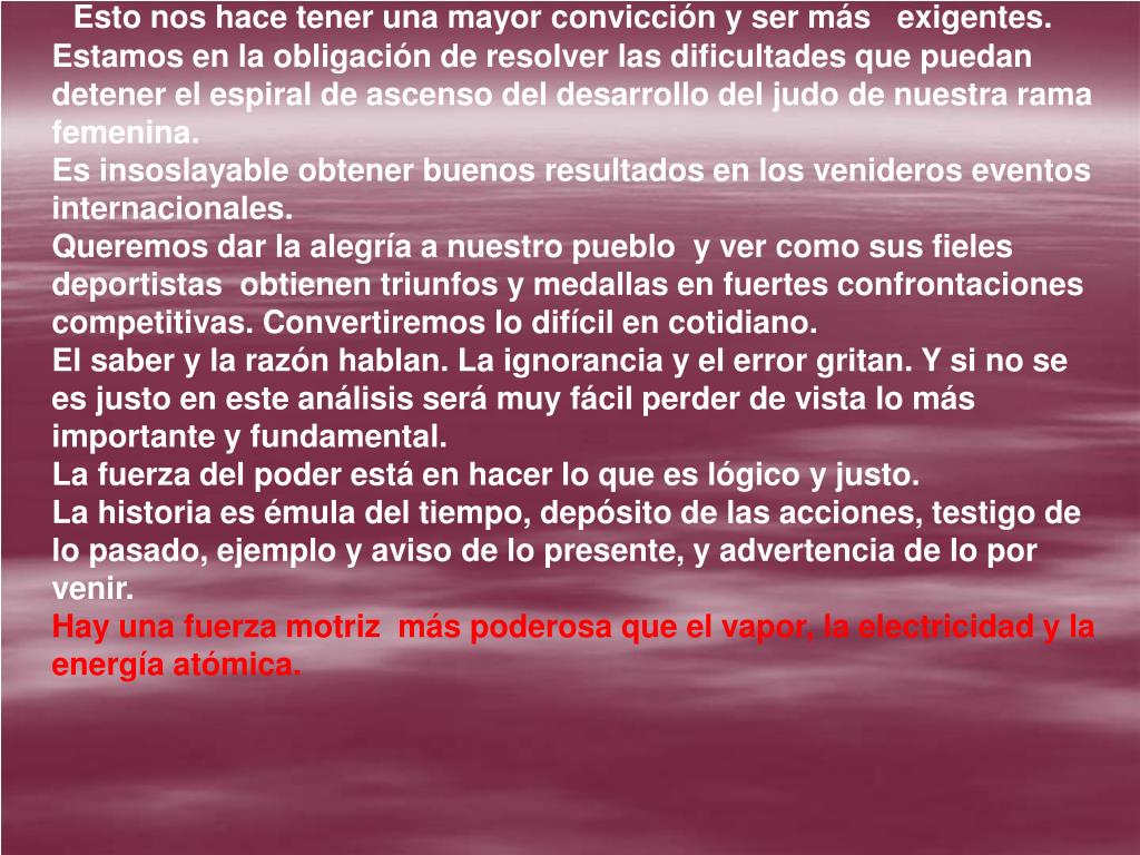 Esto nos hace tener una mayor convicción y ser más exigentes. Estamos en la obligación de resolver las dificultades que puedan detener el espiral de ascenso del desarrollo del judo de nuestra rama femenina. Es insoslayable obtener buenos resultados en los venideros eventos internacionales. Queremos dar la alegría a nuestro pueblo y ver como sus fieles deportistas obtienen triunfos y medallas en fuertes confrontaciones competitivas. Convertiremos lo difícil en cotidiano. El saber y la razón hablan. La ignorancia y el error gritan. Y si no se es justo en este análisis será muy fácil perder de vista lo más importante y fundamental. La fuerza del poder está en hacer lo que es lógico y justo. La historia es émula del tiempo, depósito de las acciones, testigo de lo pasado, ejemplo y aviso de lo presente, y advertencia de lo por venir. Hay una fuerza motriz más poderosa que el vapor, la electricidad y la energía atómica.