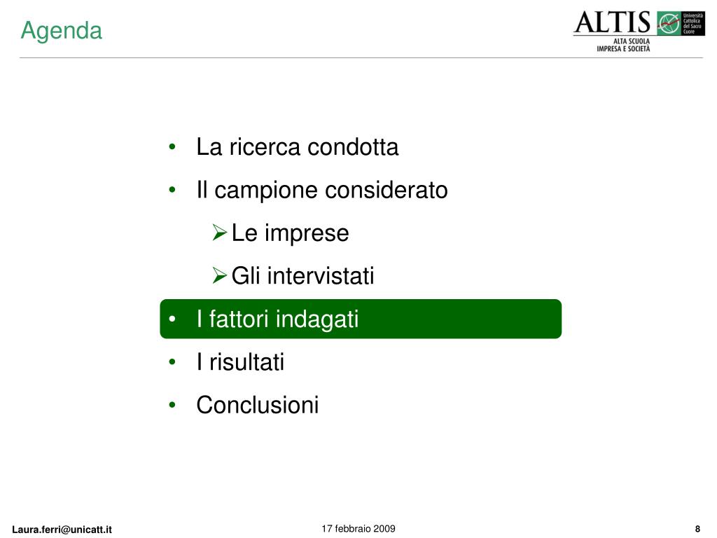 Agenda • La ricerca condotta • Il campione considerato • Le imprese • Gli intervistati • I fattori indagati • I risultati • Conclusioni