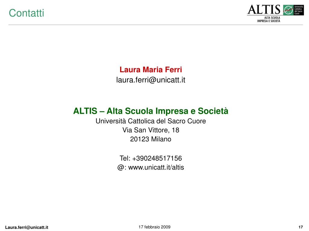 Contatti Laura Maria Ferri laura.ferri@unicatt.it ALTIS – Alta Scuola Impresa e Società Università Cattolica del Sacro Cuore Via San Vittore, 18 20123 Milano Tel: +390248517156 @: www.unicatt.it/altis