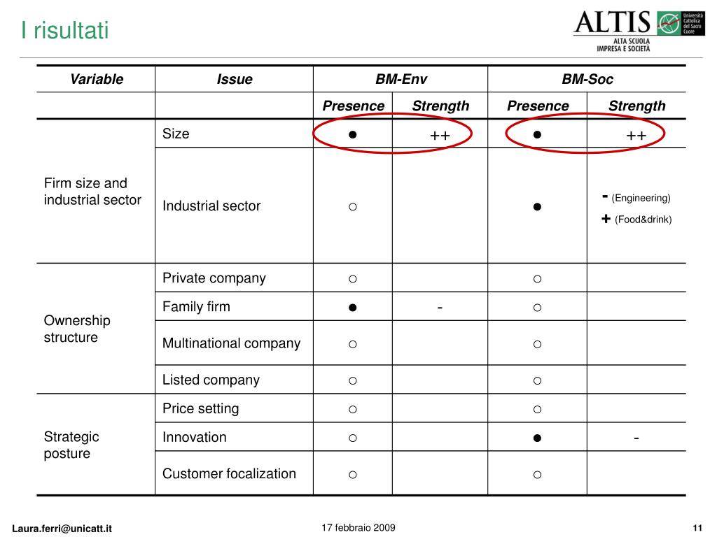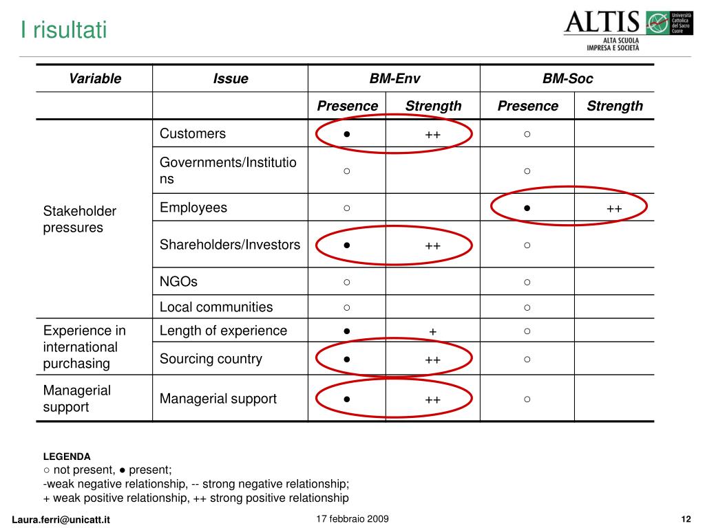 I risultati • LEGENDA • ○ not present, ● present; • weak negative relationship, -- strong negative relationship; • + weak positive relationship, ++ strong positive relationship
