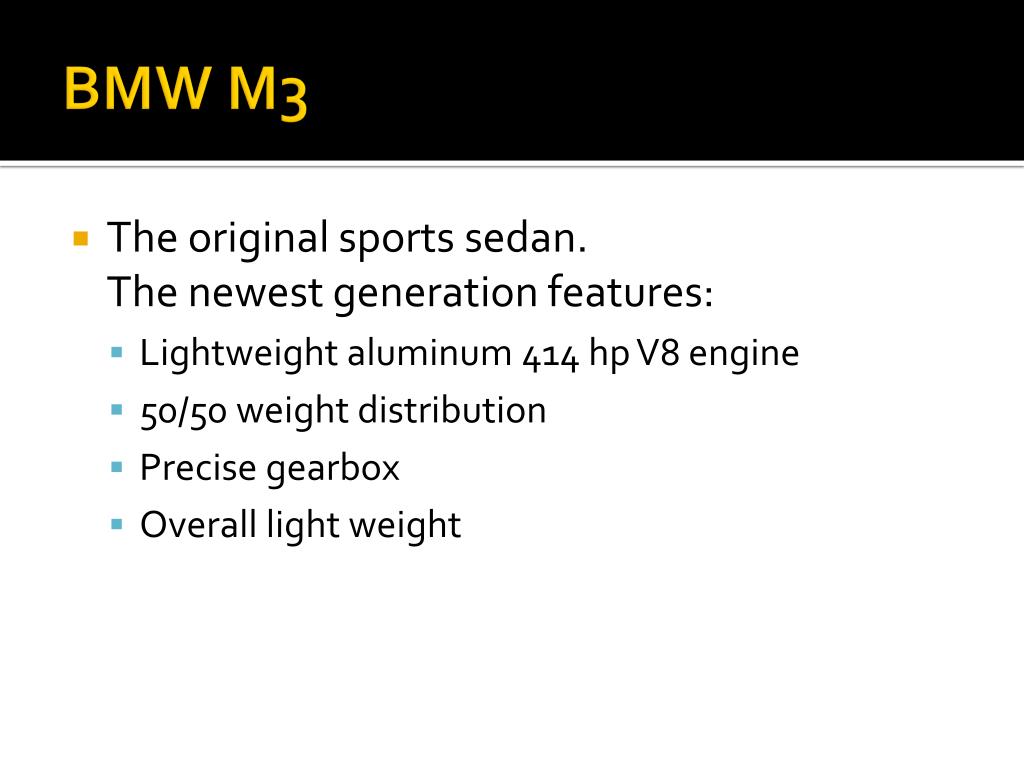 BMW M3 • The original sports sedan. The newest generation features: • Lightweight aluminum 414 hp V8 engine • 50/50 weight distribution • Precise gearbox • Overall light weight