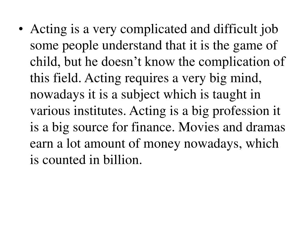 Acting is a very complicated and difficult job some people understand that it is the game of child, but he doesn’t know the complication of this field. Acting requires a very big mind, nowadays it is a subject which is taught in various institutes. Acting is a big profession it is a big source for finance. Movies and dramas earn a lot amount of money nowadays, which is counted in billion.