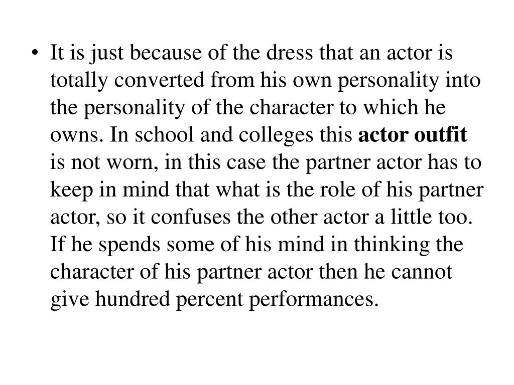 It is just because of the dress that an actor is totally converted from his own personality into the personality of the character to which he owns. In school and colleges this actor outfit is not worn, in this case the partner actor has to keep in mind that what is the role of his partner actor, so it confuses the other actor a little too. If he spends some of his mind in thinking the character of his partner actor then he cannot give hundred percent performances.
