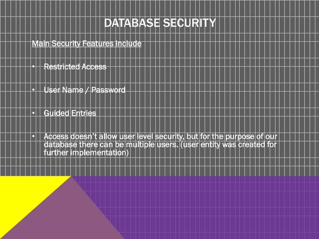 Database Security • Main Security Features include • Restricted Access • User Name / Password • Guided Entries • Access doesn’t allow user level security, but for the purpose of our database there can be multiple users. (user entity was created for further implementation)