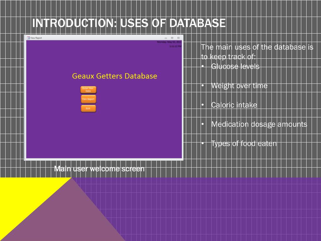 Introduction: uses of database • The main uses of the database is to keep track of: • Glucose levels • Weight over time • Caloric intake • Medication dosage amounts • Types of food eaten Main user welcome screen