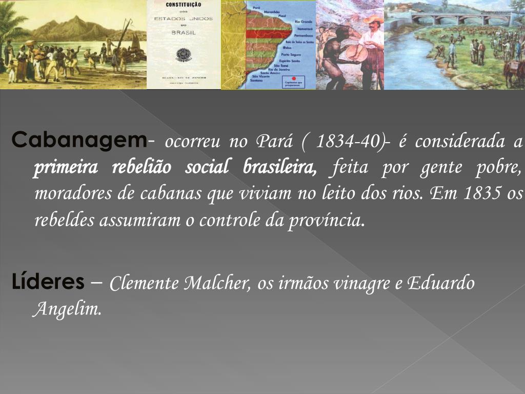 Cabanagem- ocorreu no Pará ( 1834-40)- é considerada a primeira rebelião social brasileira, feita por gente pobre, moradores de cabanas que viviam no leito dos rios. Em 1835 os rebeldes assumiram o controle da província. Líderes – Clemente Malcher, os irmãos vinagre e Eduardo Angelim.