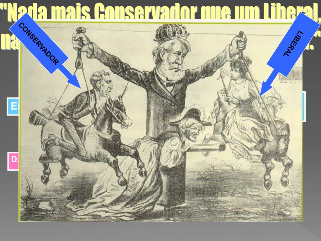 "Nada mais Conservador que um Liberal, nada mais Liberal que um Conservador." CONSERVADOR LIBERAL Tentativa do Marquês do Paraná de unir Liberais e Conservadores. Era da Conciliação A quem não o contestasse no seu absolutismo. D. Pedro II LIGA-SE