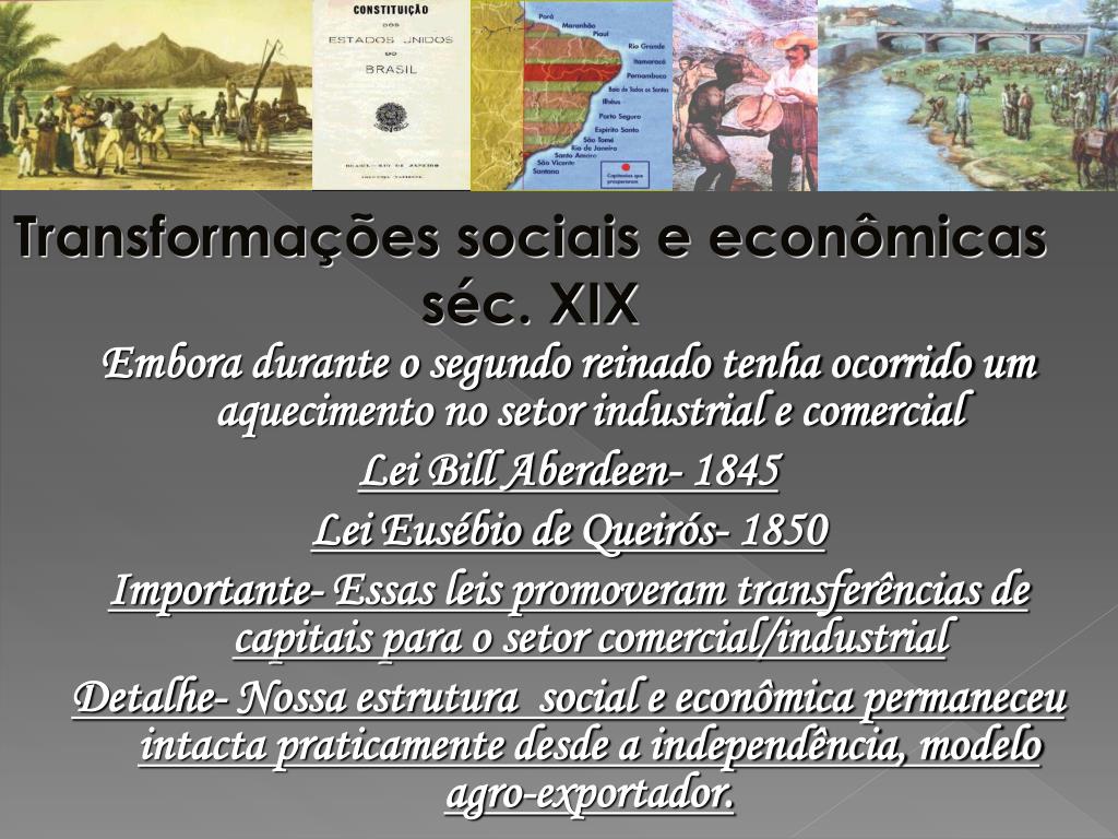 Transformações sociais e econômicas séc. XIX Embora durante o segundo reinado tenha ocorrido um aquecimento no setor industrial e comercial Lei Bill Aberdeen- 1845 Lei Eusébio de Queirós- 1850 Importante- Essas leis promoveram transferências de capitais para o setor comercial/industrial Detalhe- Nossa estrutura social e econômica permaneceu intacta praticamente desde a independência, modelo agro-exportador.