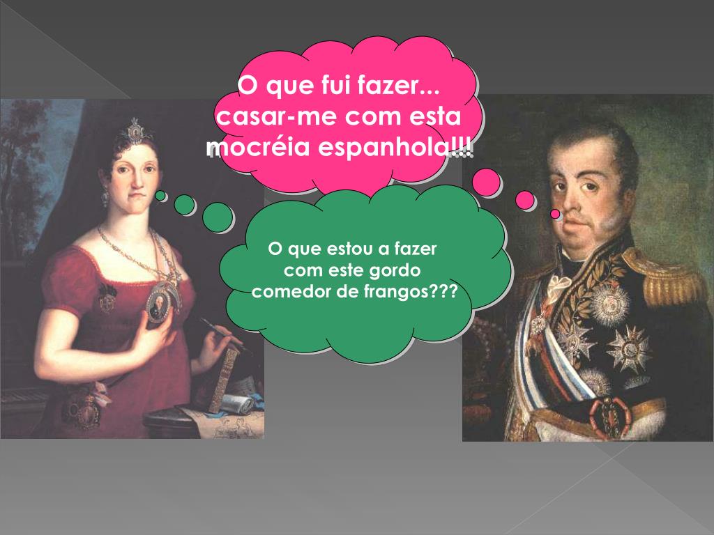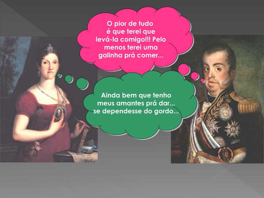 Independência do Brasil . Família Real no Brasil. Bloqueio Continental. O que fui fazer... casar-me com esta mocréia espanhola!!!. O que estou a fazer com este gordo comedor de frangos???. O pior de tudo é que terei que levá-la comigo!!! Pelo menos terei uma galinha prá comer.