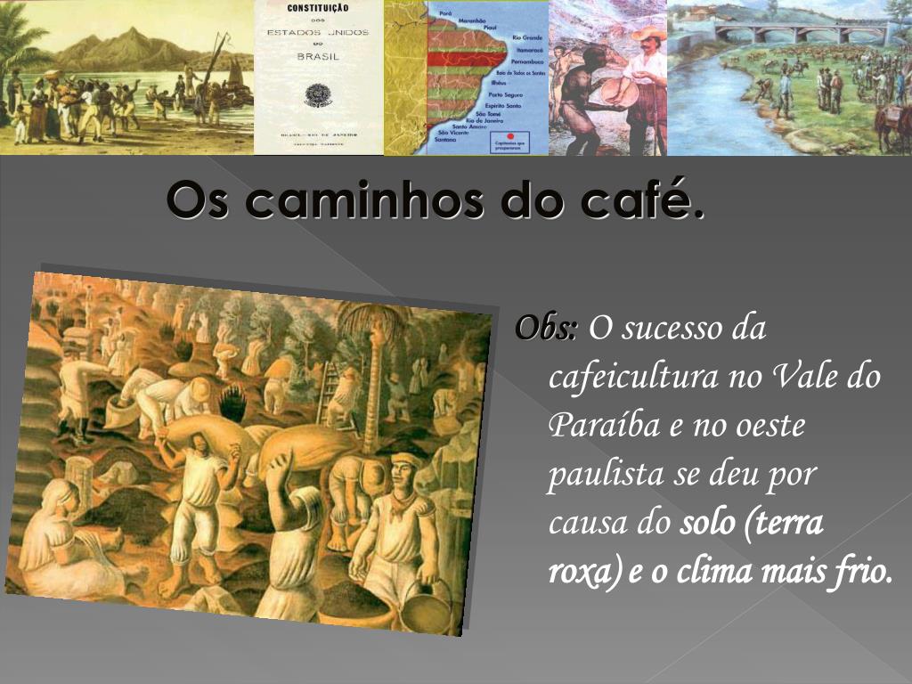 Os caminhos do café. Obs: O sucesso da cafeicultura no Vale do Paraíba e no oeste paulista se deu por causa do solo (terra roxa) e o clima mais frio.