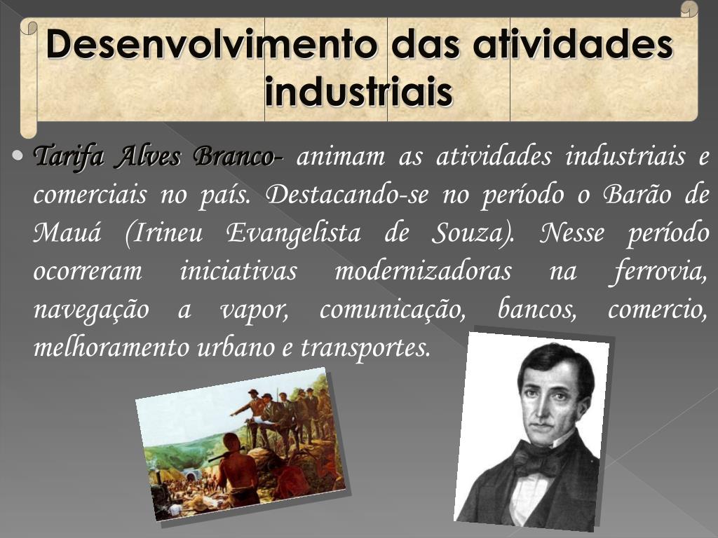 Desenvolvimento das atividades industriais • Tarifa Alves Branco- animam as atividades industriais e comerciais no país. Destacando-se no período o Barão de Mauá (Irineu Evangelista de Souza). Nesse período ocorreram iniciativas modernizadoras na ferrovia, navegação a vapor, comunicação, bancos, comercio, melhoramento urbano e transportes.