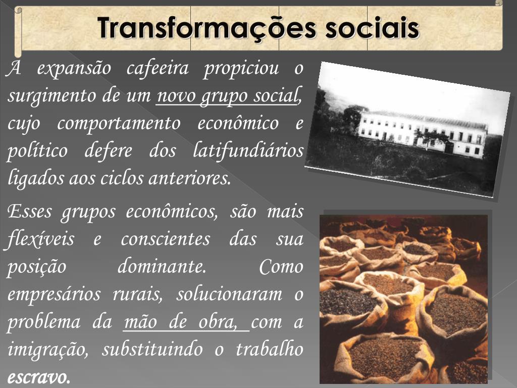 Transformações sociais A expansão cafeeira propiciou o surgimento de um novo grupo social, cujo comportamento econômico e político defere dos latifundiários ligados aos ciclos anteriores. Esses grupos econômicos, são mais flexíveis e conscientes das sua posição dominante. Como empresários rurais, solucionaram o problema da mão de obra, com a imigração, substituindo o trabalho escravo.
