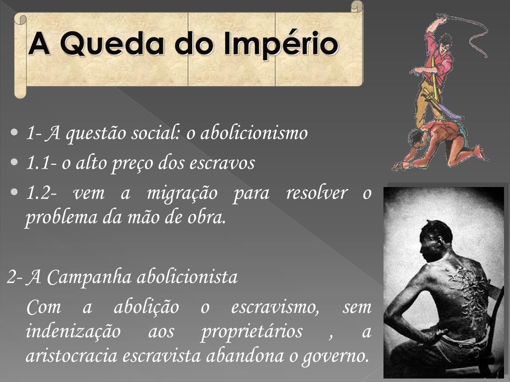A Queda do Império • 1- A questão social: o abolicionismo • 1.1- o alto preço dos escravos • 1.2- vem a migração para resolver o problema da mão de obra. • 2- A Campanha abolicionista • Com a abolição o escravismo, sem indenização aos proprietários , a aristocracia escravista abandona o governo.