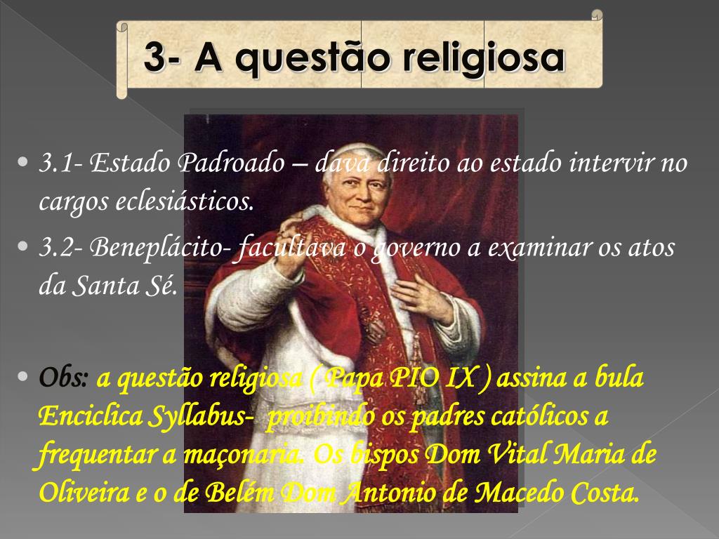 3- A questão religiosa • 3.1- Estado Padroado – dava direito ao estado intervir no cargos eclesiásticos. • 3.2- Beneplácito- facultava o governo a examinar os atos da Santa Sé. • Obs:a questão religiosa ( Papa PIO IX ) assina a bula Enciclica Syllabus- proibindo os padres católicos a frequentar a maçonaria. Os bispos Dom Vital Maria de Oliveira e o de Belém Dom Antonio de Macedo Costa.
