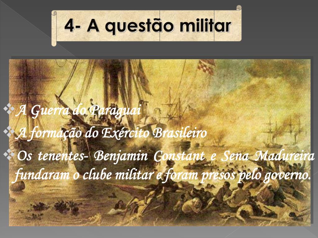 4- A questão militar • A Guerra do Paraguai • A formação do Exército Brasileiro • Os tenentes- Benjamin Constant e Sena Madureira fundaram o clube militar e foram presos pelo governo.