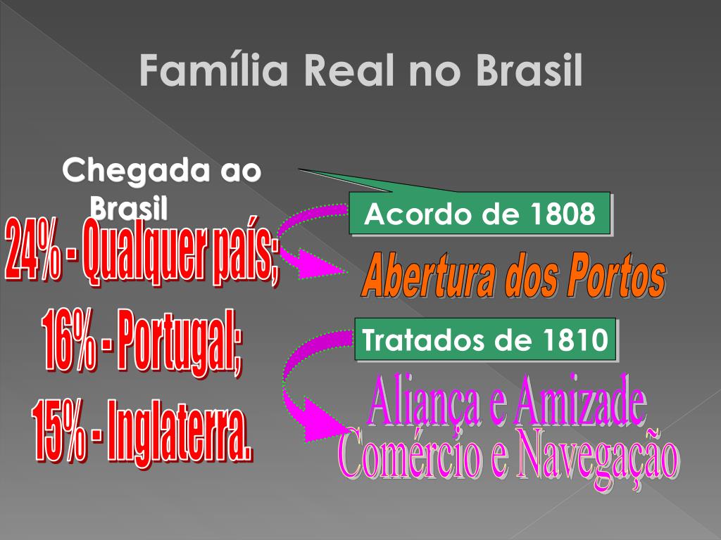 Família Real no Brasil Chegada ao Brasil Acordo de 1808 24% - Qualquer país; 16% - Portugal; 15% - Inglaterra. Abertura dos Portos Tratados de 1810 Aliança e Amizade Comércio e Navegação