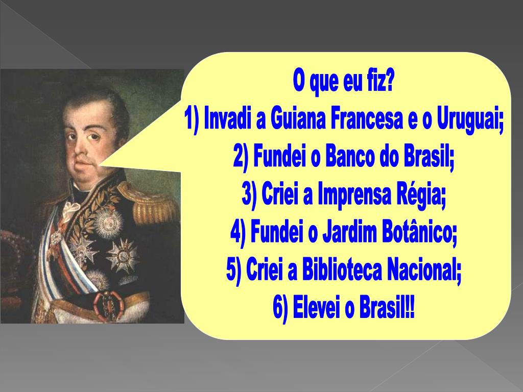 O que eu fiz? 1) Invadi a Guiana Francesa e o Uruguai; 2) Fundei o Banco do Brasil; 3) Criei a Imprensa Régia; 4) Fundei o Jardim Botânico; 5) Criei a Biblioteca Nacional; 6) Elevei o Brasil!!