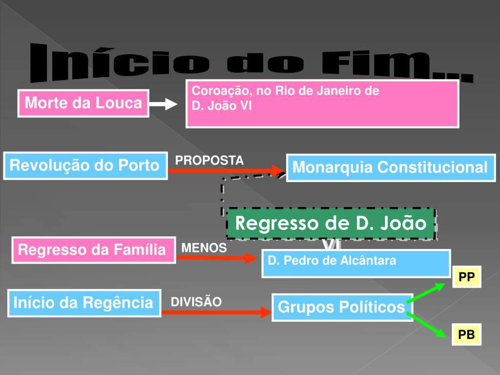 Início do Fim... Coroação, no Rio de Janeiro de D. João VI Morte da Louca PROPOSTA Revolução do Porto Monarquia Constitucional Regresso de D. João VI Regresso da Família MENOS D. Pedro de Alcântara PP Início da Regência DIVISÃO Grupos Políticos PB