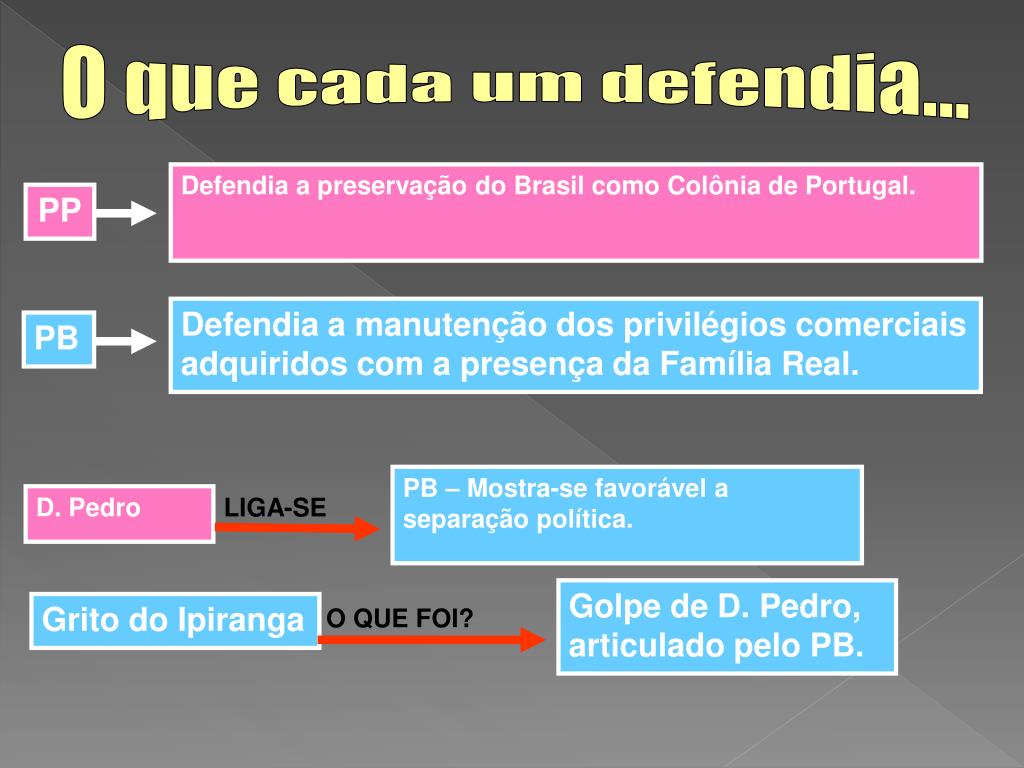 O que cada um defendia... Defendia a preservação do Brasil como Colônia de Portugal. PP Defendia a manutenção dos privilégios comerciais adquiridos com a presença da Família Real. PB PB – Mostra-se favorável a separação política. D. Pedro LIGA-SE Golpe de D. Pedro, articulado pelo PB. Grito do Ipiranga O QUE FOI?