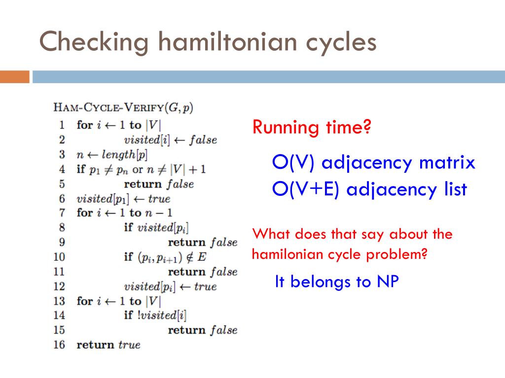 Checking hamiltonian cycles Running time? O(V) adjacency matrix O(V+E) adjacency list What does that say about the hamilonian cycle problem? It belongs to NP