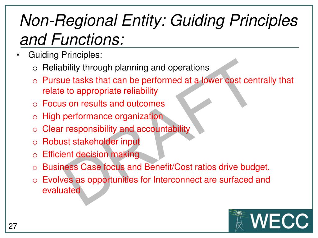 Non-Regional Entity: Guiding Principles and Functions (continued): • Functions: • Reliability Coordinator • Interchange Authority • Transmission Expansion Planning • Planning services (e.g., Base case development, path rating studies, etc.) • System Operator Training • Regional Criteria • Interconnection tools (WISP, WIT, webSAS) • Member Committees