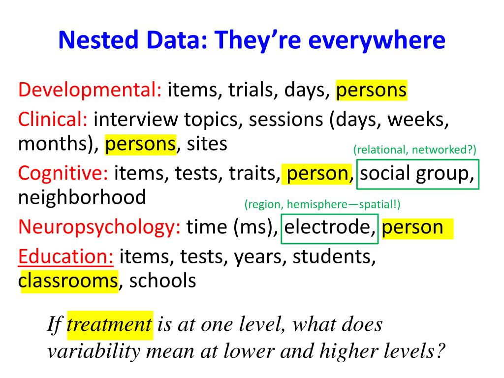 Nested Data: They’re everywhere Developmental: items, trials, days, persons Clinical: interview topics, sessions (days, weeks, months), persons, sites Cognitive: items, tests, traits, person, social group, neighborhood Neuropsychology: time (ms), electrode, person Education: items, tests, years, students, classrooms, schools (relational, networked?) (region, hemisphere—spatial!) If treatment is at one level, what does variability mean at lower and higher levels?