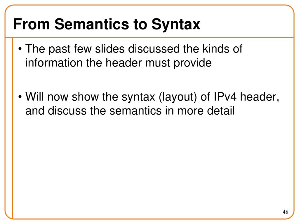 From Semantics to Syntax • The past few slides discussed the kinds of information the header must provide • Will now show the syntax (layout) of IPv4 header, and discuss the semantics in more detail