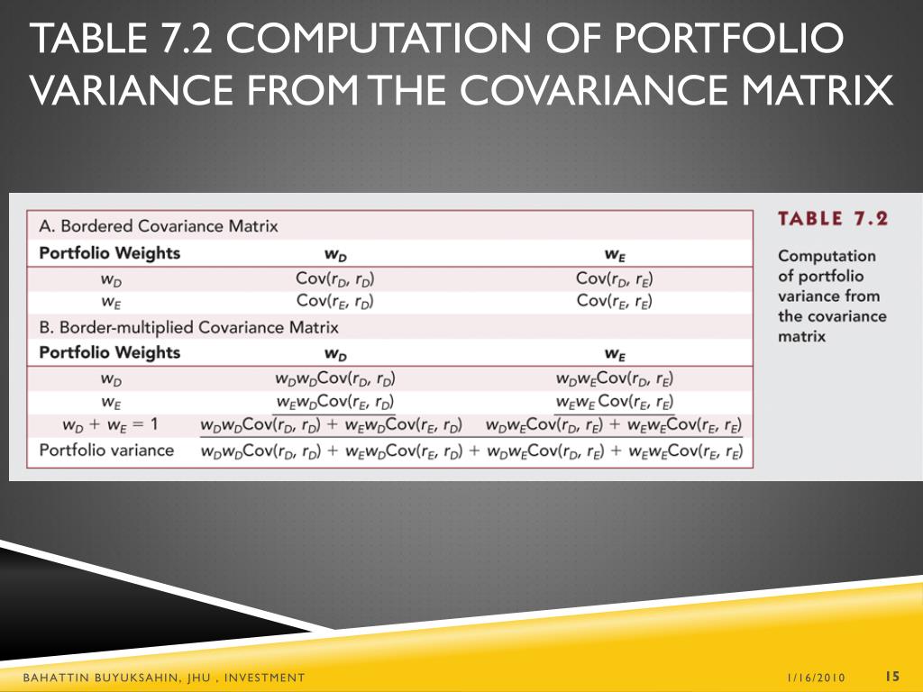 Table 7.2 Computation of Portfolio Variance From the Covariance Matrix Bahattin Buyuksahin, JHU , Investment