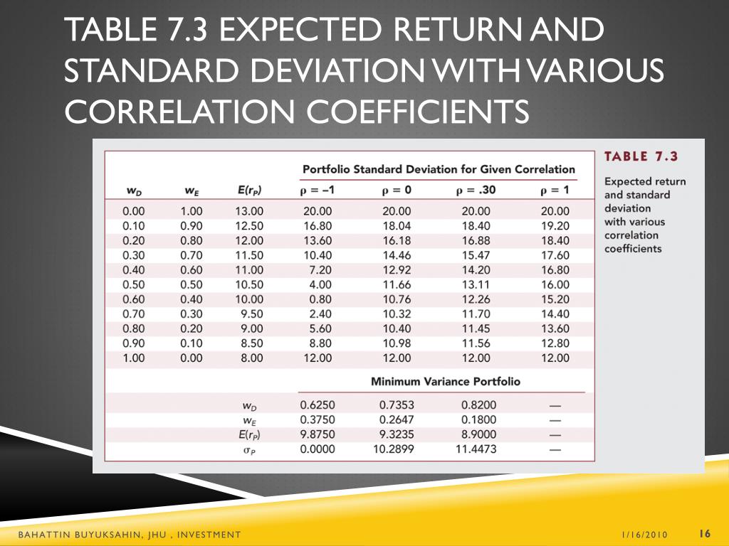 Table 7.3 Expected Return and Standard Deviation with Various Correlation Coefficients Bahattin Buyuksahin, JHU , Investment