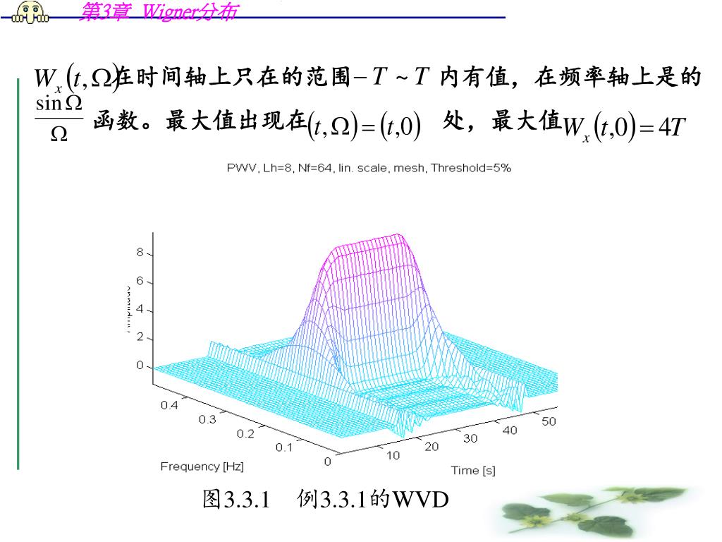 图3.3.1 例3.3.1的WVD 在时间轴上只在的范围 内有值,在频率轴上是的函数。最大值出现在 处,最大值
