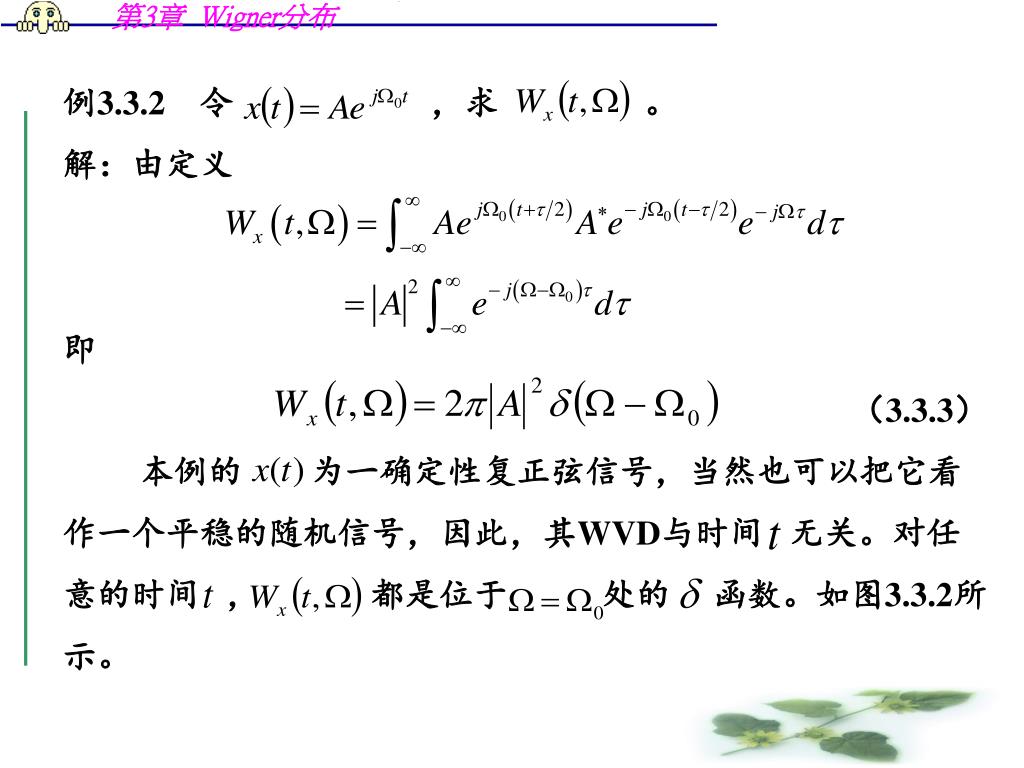 例3.3.2 令 ,求 。 • 解:由定义 • 即 • (3.3.3) • 本例的 为一确定性复正弦信号,当然也可以把它看 • 作一个平稳的随机信号,因此,其WVD与时间 无关。对任 • 意的时间 , 都是位于 处的 函数。如图3.3.2所 • 示。